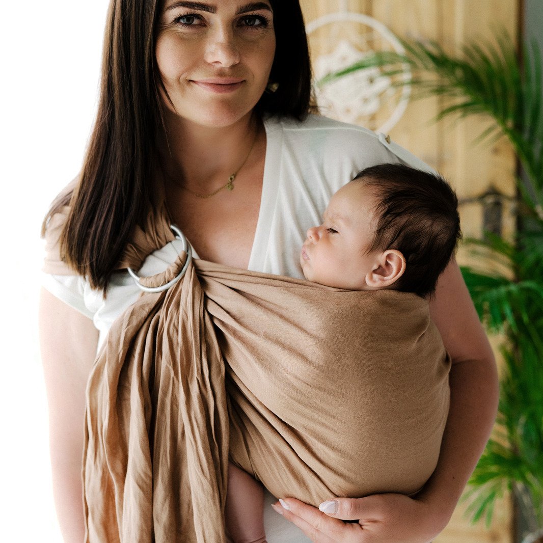 Le sling est une écharpe courte, avec deux anneaux cousus à une de ses extrémités. Il est très rapide et facile d’installation, une fois qu’on a pris le coup de main. L’apprentissage de l’utilisation d’une écharpe sling est très rapide. Le Sling s’installe et s’ajuste facilement grâce aux 2 anneaux en aluminium.